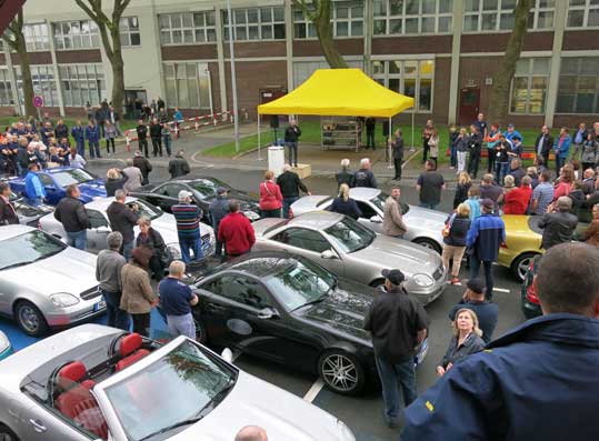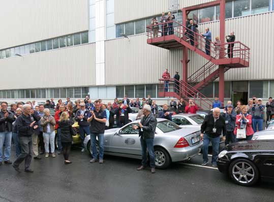An der Halle 3 parkten alle Fahrzeuge und der Standortverantwortlicher Herr Peter Theurer begrüßte alle Teilnehmer und berichtete über die Fertigung des SLKs.