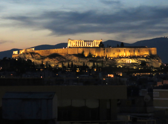 Mit dem SLK auf SüdOstEuropa-Tour Blick von unserem Balkon in der 7. Etage auf die Acropolis